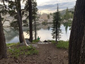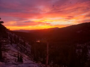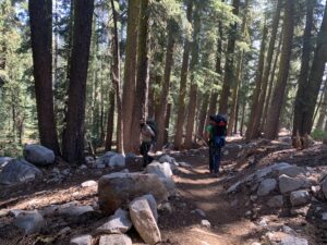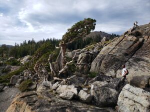There was no telling how much time had passed. The entire hike up until this point felt like one moment frozen in time. As we made our way down the mountain, a few Whitebark Pine trees danced, reaching for the sky. Their wavy branches and contorted bodies, mangled from heavy snowfall and hurricane-like winds in the wintertime, seemed to sway like snakes in a lake, ripples radiating from their frolicking branch tips. Then, suddenly, the sun was gone, and we were in a dense forest, surrounded by pines and redwoods. Splotches of sunlight poured in through the canopies like a gentle stream, and in every corner of my eye, something moved. I mumbled some incoherent nonsense about Sasquatch after witnessing some strange movement off behind a tree. Jeesh and Sop chuckled, their laughter rising in invisible bubbles that I couldn’t see but could surely sense.