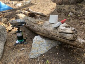 Once our tents were all up, water was gathered from the crystal-clear body of Paradise Lake. Filtering water was by no means a speedy process. So, using one of the many granite slabs surrounding our site, we hung my BeFree water bag from a large stone with a pointed triangular top. This system allowed us to always be filling a tumbler up with water. Sop would fill his jug, and then Jeesh, and when it was my turn, I’d balance my tumbler to catch the slow-dripping water. Every five minutes or so, I’d go check my water jug, and once it was filled, it would be time to gather more water from the lake. The process would repeat until our bellies and our containers were full of mountain water. We ate a small snack, unpacked some essentials, and let out a breath of relief, hands on our hips, victorious at last.