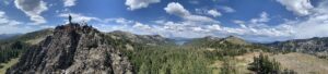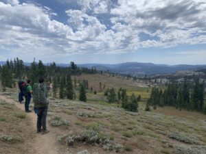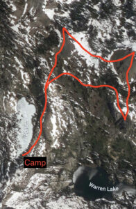 A large lookout rock loomed just north of our camp. The three of us peered out over the blue lake and into Paradise Valley. Far off, slightly northeast of the lake and high up on a mountaintop, a small bundle of black rocks lay on the horizon like monoliths with open arms. The landscape ahead of us was mostly white with granite or green with brush and pine tops, with specks of brown from the exposed trunks. However, these strange-looking rocks in the distance were completely foreign to any of the other aesthetics in sight. We were instantly intrigued, and it was decided. That would be our first destination for our day hike.