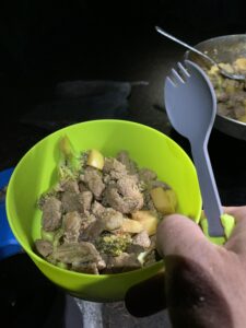 “Welp, I think we’re good! Smells fine to me.” Sop tilted the container over the skillet, now sizzling with butter, and started to shovel the contents out onto the pan. A beautiful medley of steak, broccoli, and potatoes started to fall out of the tumbler, sputtering with grease and fat as they touched the hot skillet. Eating fresh food while backpacking is not a commonality, and up until that point, our taste buds had only been exposed to trail mix, beef jerky, Cliff bars, and freeze-dried dinners. Fresh food never tasted so good, and it wasn’t long before the entire skillet had been devoured.